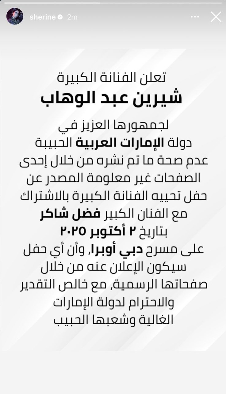 وأكدت شيرين في بيانها أن أي حفل لها سيتم الإعلان عنه من خلال صفحاتها الرسمية على مواقع التواصل الاجتماعي.