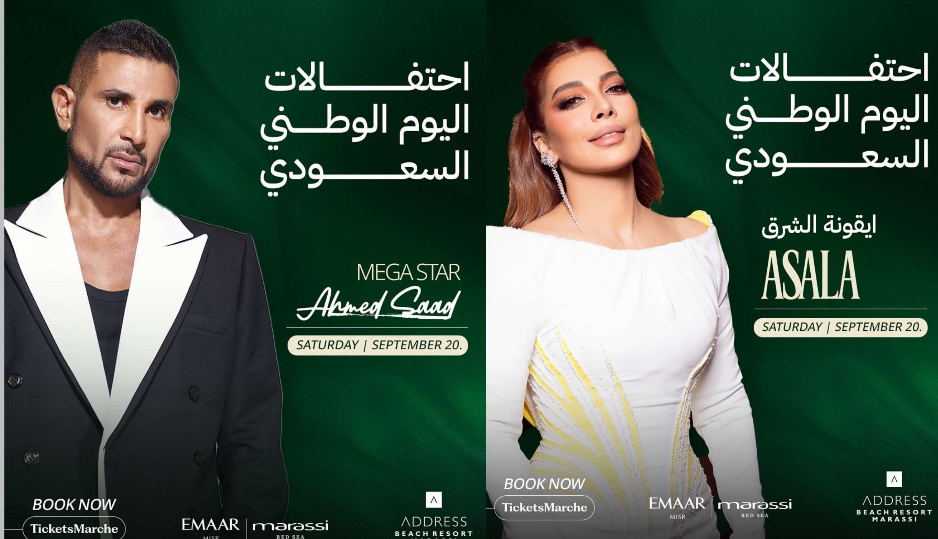 تحيي الفنانة أصالة نصري والفنان أحمد سعد، مساء اليوم، حفلًا غنائيًا ضخمًا بمناسبة اليوم الوطني السعودي، ضمن فعاليات مهرجان مراسي “ليالي مراسي”، المقام برعاية مراسي البحر الأحمر.