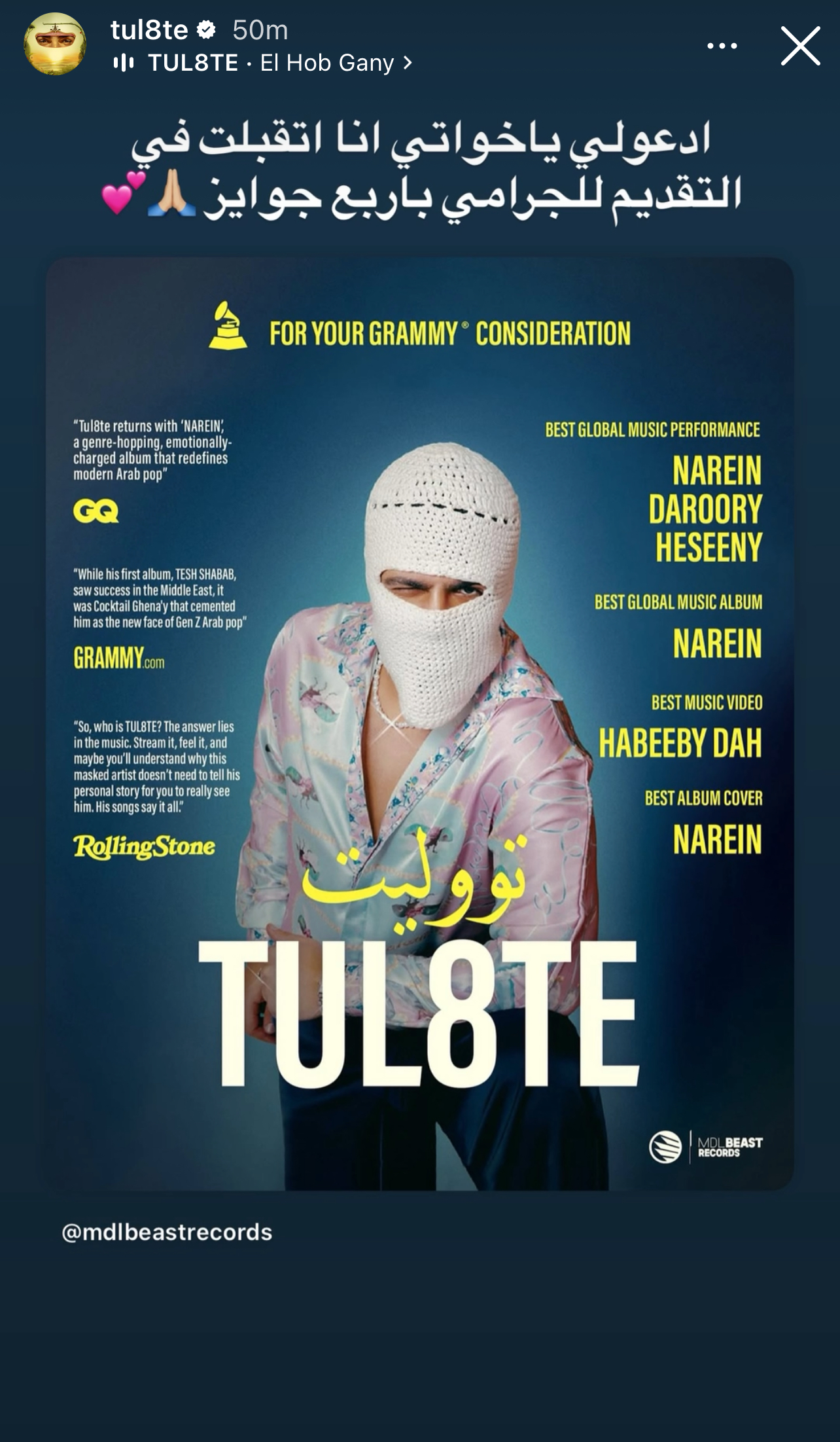ونشر تووليت عبر خاصية “ستوري” بحسابه الرسمي بمنصة “إنستجرام”، صورة يعلن بها قبول ترشحه للجرامي. قائلا: ادعولي يا اخواتي، أنا اتقبلت في التقديم للجرامي بأربع جوائز”.