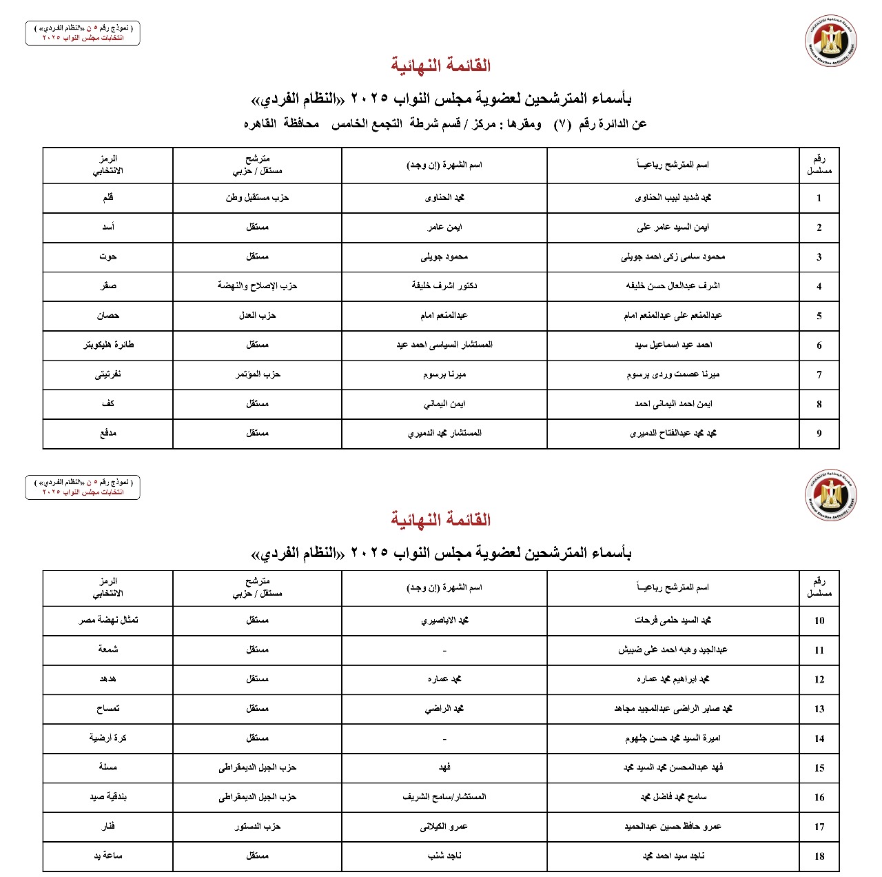 | رقم مسلسل | اسم المرشح رباعيًا | اسم الشهرة (إن وجد) | مرشح مستقل / حزبي | الرمز الانتخابي |