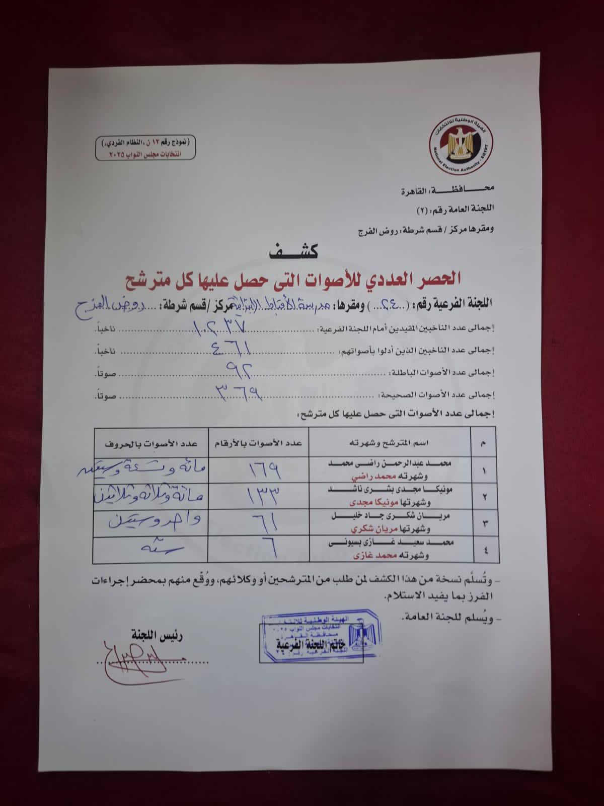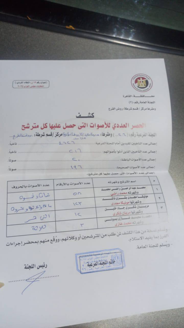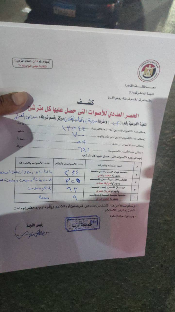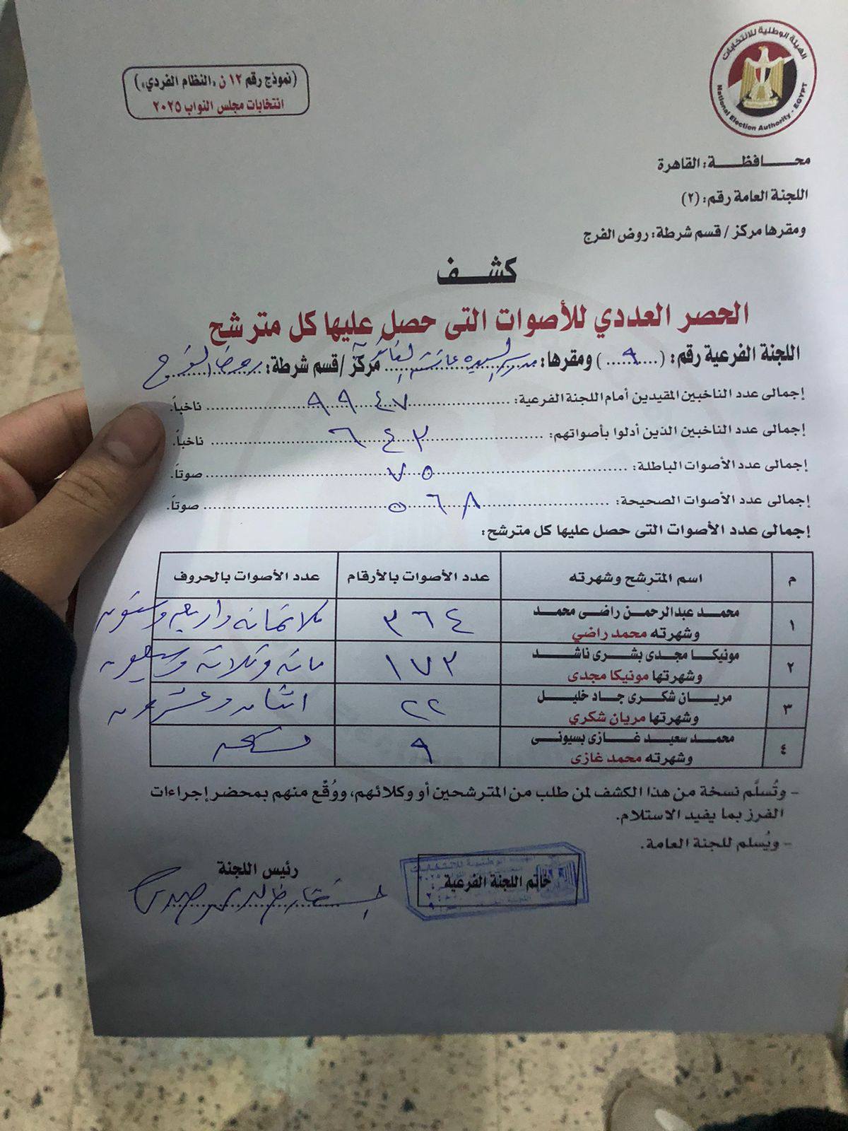 وأظهر الحصر العددي الأولي للأصوات حصول مونيكا مجدي على 2127 صوتًا مقابل 3116 صوتًا للمرشح محمد راضي، وذلك بعد الفرز في 34 لجنة حتى الآن، ما يؤكد توجه الدائرة رسميًا إلى الإعادة.