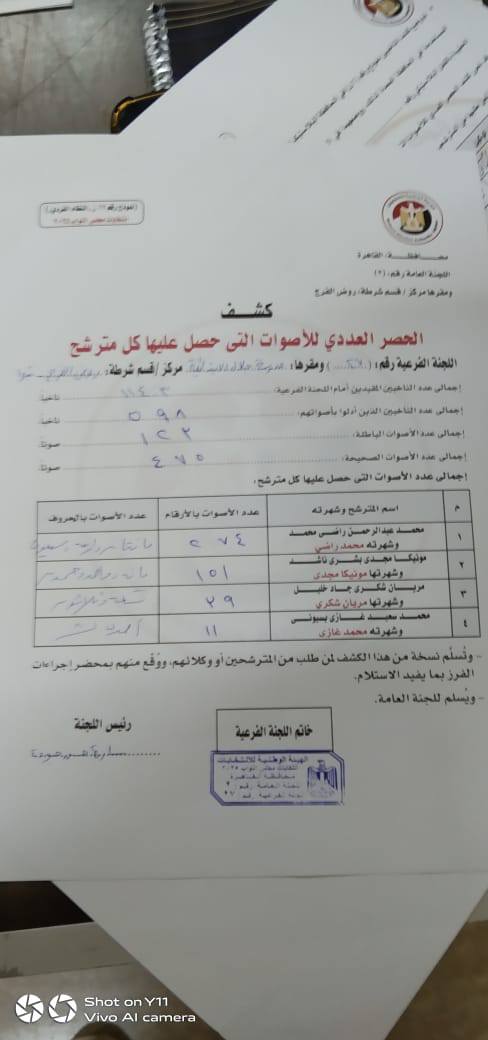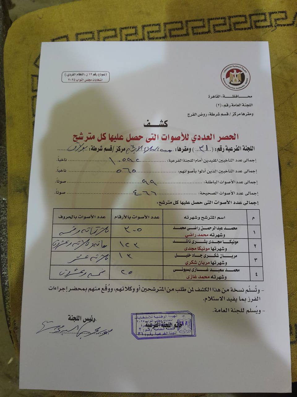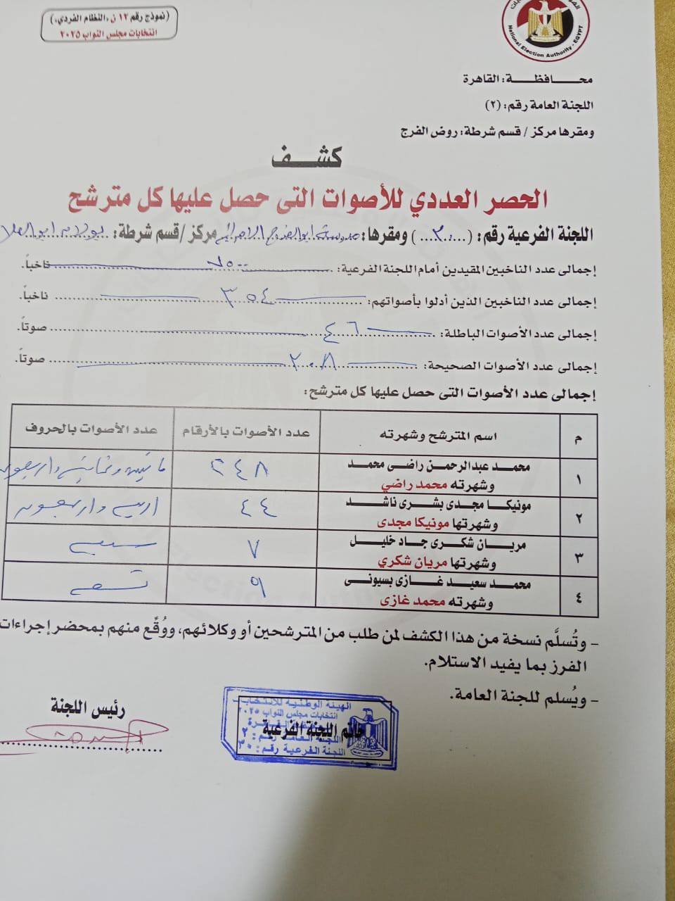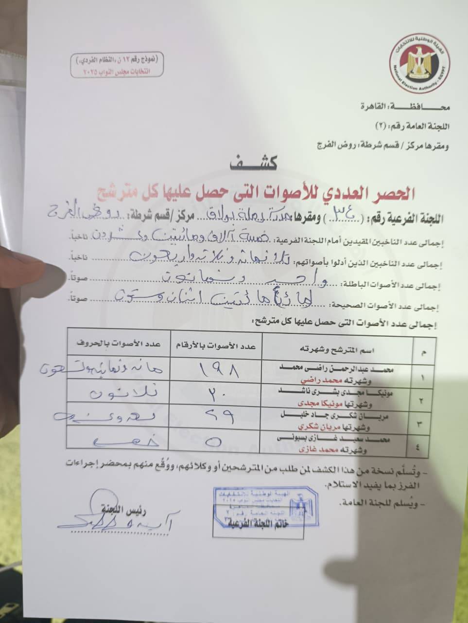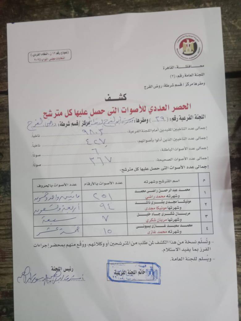 وأظهر الحصر العددي الأولي للأصوات حصول مونيكا مجدي على 2127 صوتًا مقابل 3116 صوتًا للمرشح محمد راضي، وذلك بعد الفرز في 34 لجنة حتى الآن، ما يؤكد توجه الدائرة رسميًا إلى الإعادة.