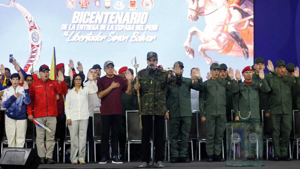 وخاطب مادورو ضباطه وجنوده قائلاً: “إن ما يحدث حالياً هو انتصار للسلام على الفاشية الداخلية والخارجية. الاستقلال والسلام هما إرث لا يتجزأ من وجود جمهوريتنا.. الآن وإلى الأبد”.
